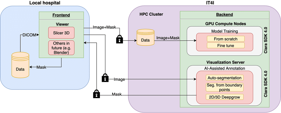 The evaluated concept consists of two main parts. The first one runs at a medical doctor’s site in the hospital, and the other one operates at IT4Innovations National Supercomputing Center. The part at the hospital is represented by a frontend that mediates the interaction between the doctor and the data. An open-source 3D Slicer was chosen to provide this functionality, and it facilitates the interconnection to a backend part. The backend part provides the computational power of an HPC cluster and other required features. It enables the training of deep learning models for automatic segmentation and model inference of incoming image data. We have adopted the NVIDIA’s Clara Train SDK to create the backend part.