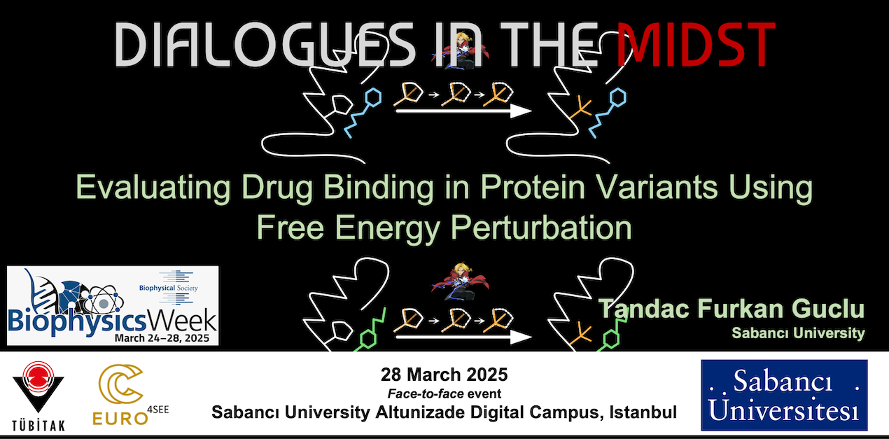 In this workshop, we use the enzyme dihydrofolate reductase (DHFR), a model protein for antibiotic resistance studies as an example system. We will perform FEP simulations on single mutational variants of DHFR bound to two drugs, TMP and 4'DTMP, and calculate the relative binding energies to determine the more favorable drug. This workshop will combine theory and application. In the morning, we will first learn about the fundamentals of FEP simulation and how to perform these simulations on a high-performance computer (TRUBA), after which we will run an FEP simulation on TRUBA. Each attendee will also run an FEP simulation using their temporary account. In the afternoon, we will discuss thermodynamic cycles, how to calculate relative binding energies, and how to analyze the FEP simulations. We will examine the outputs in depth through the lenses of computation, biophysics, and evolution.