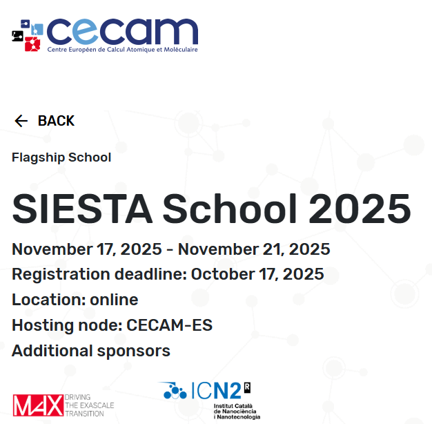 SIESTA [1,2] is a multipurpose density-functional code able to perform efficient electronic structure calculations and ab initio molecular dynamics simulations of molecules and solids in fields that range from Geoscience, Biology, Nanoscience, Chemistry or Condensed Matter. It has become very popular worldwide, being used by thousands of researchers in both academia and industry. A very important feature is that its accuracy and cost can be tuned in a wide range, from quick exploratory calculations to highly accurate simulations matching the quality of other approaches, such as plane-wave methods, at a reduced computational cost. However, this flexibility can also represent a challenge for new users of the code, that need to get acquainted with a good number of specific nuts and bolts. The school is aimed at students and researchers from different disciplines in materials science who use, or plan to use, the SIESTA package. The students will learn its essential theoretical foundations, and to how to use the SIESTA code effectively (parallelization and new, more efficient, solvers). Pre- and post-processing tools will also be presented. More advanced features, such as the computation of quantum transport using the non-equilibrium Green's function approach, will be introduced towards the end of the week [2].